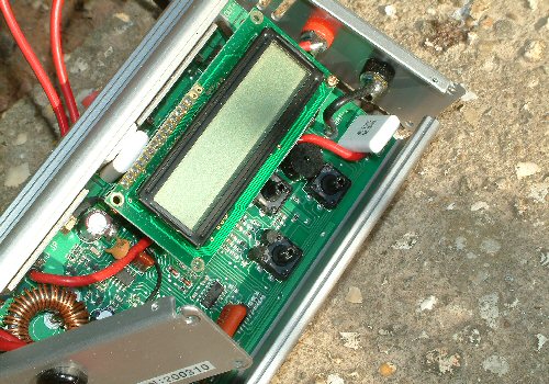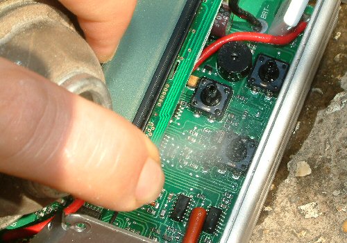 Mark Moran's LiPro Plus charger in a dissassembled state. | The charger's circuit board. The four switches which the buttons press down on are the row of four black dots along the bottom of the board. |