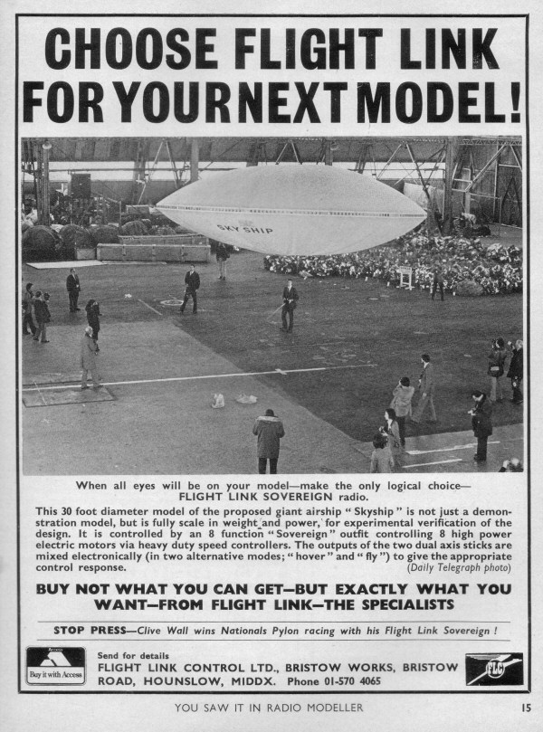 A specially adapted Flight Link multi-channel proportional radio control system was used to control the airship. The receiver was connected to a large aluminium box containing a number of relays for motor speed control. Probably this meant that motor control was of the off/half/full speed variety, either forwards or backwards. The four electric motors were evenly spaced around the ring beam’s periphery. These could be vectored using the RC servos. Thus, the motors could be used to provide full directional control.