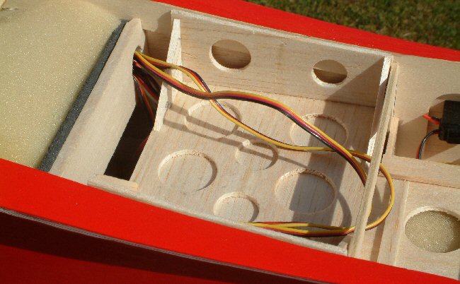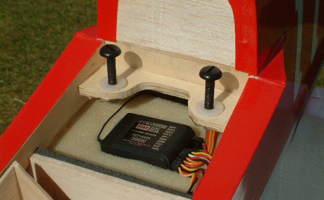 The receiver is located low down in the fuselage and well away from the dual BECs and the power system components, any of which are possible sources of RF interference. The receiver sits in a bed of foam to protect it and its delicate crystal from vibration. Vibration is still a factor with electric models, and may be generated by an out of balance prop and/or spinner. Take-off and landing also generate vibration as the wheels contact any bumps in the runway.