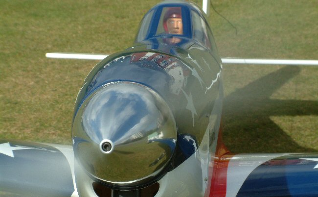 | The scale chin scoop provides ample air to cool the P51’s power system. As can be seen, the deflector, seen here painted grey, sends around 1/3 of the intake air upwards to the motor. | P51 Mustangs are usually attractive from any angle, and this one’s no exception. |
