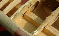 Check that all visible joints are properly glued. This ARF model was very well built. | The structure of a model must be sound. Here, the spar has been cut to clear the ribs - this was a disaster waiting to happen. |