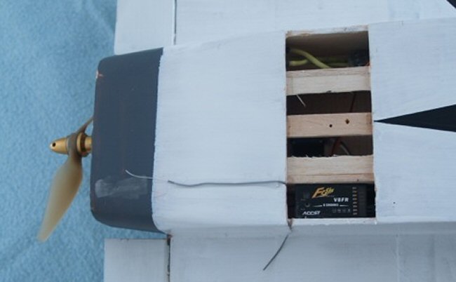 When turning an 8x6 APC i/c (gas) prop, the motor draws around 59 Amps, for a power consumption of around 725 watts. The ESC is an 80 amp opto unit. This is housed in one of the side ducts, which also provides it with adequate cooling. The battery is cooled by air entering via a NACA duct under the nose. The warmed air leaves the model on the underside near the finger launching holes.